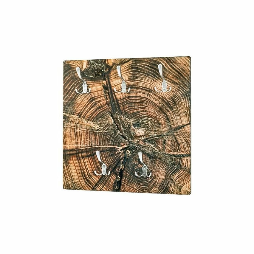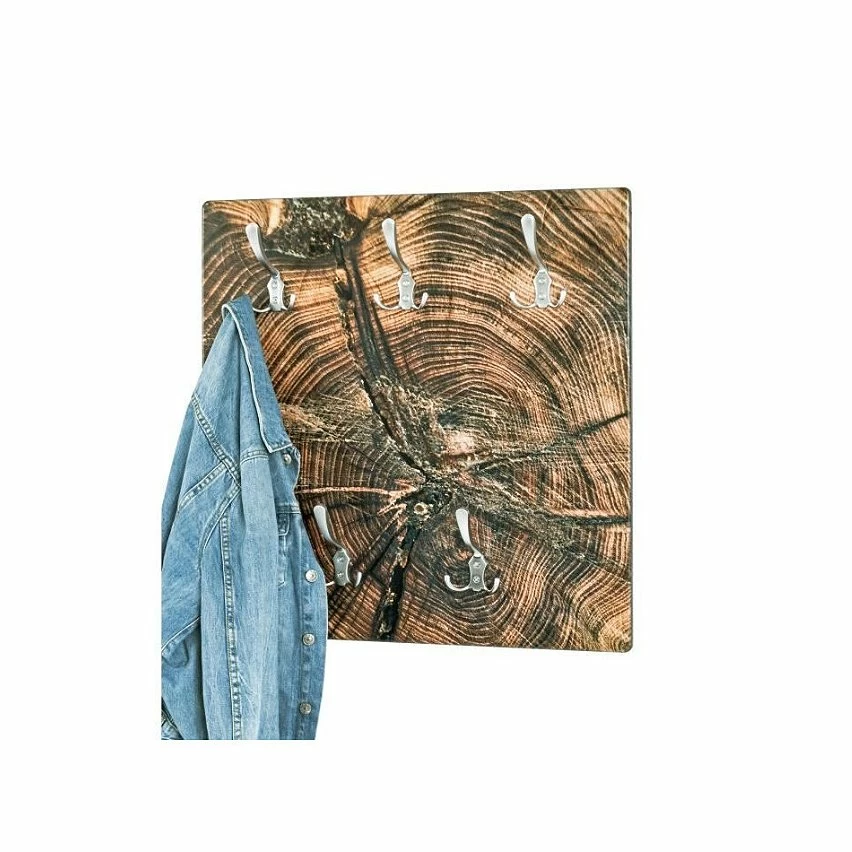 Patere murale en MDF avec impression par Ultra Violet (motif: Bois de bout), 5 crochets en métal optique inox – 60 x 60 x 9 cm