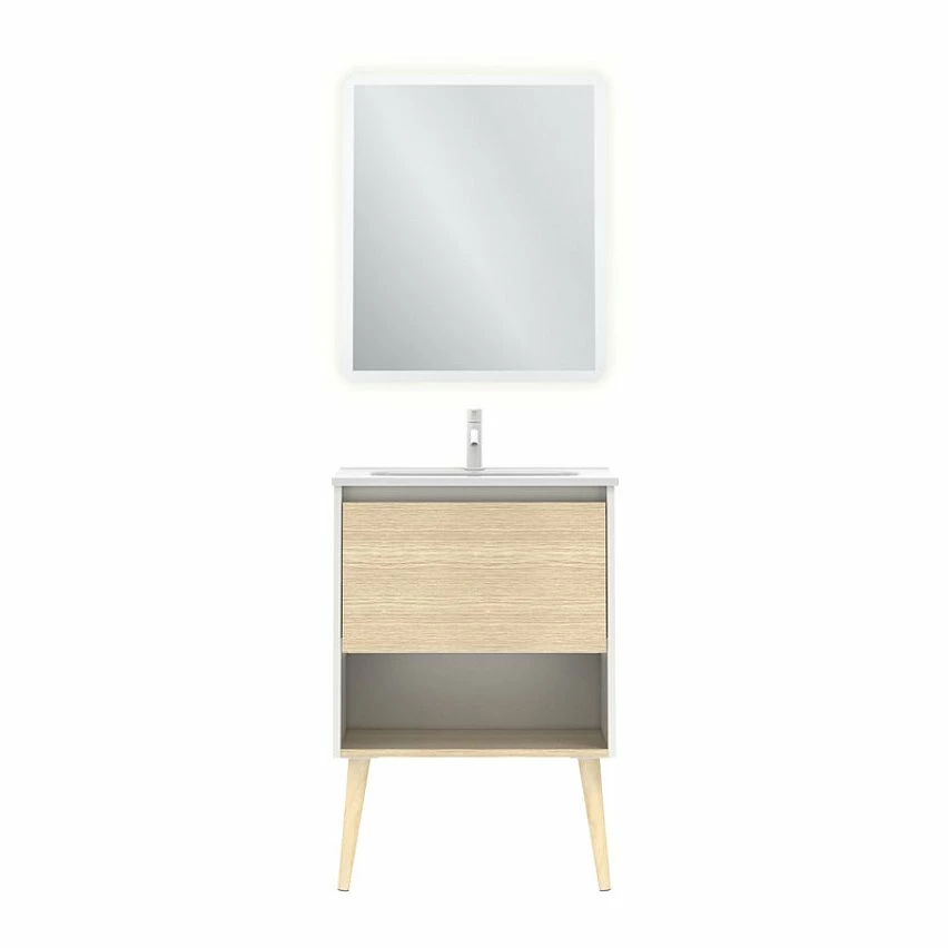 De gros 🎉 Amizuva Ensemble de meuble, vasque et miroir NARA avec un tiroir et un niche H.56,5 x L.60 x P.46 , effet Blanco Mate/ Chêne sablé 🧨