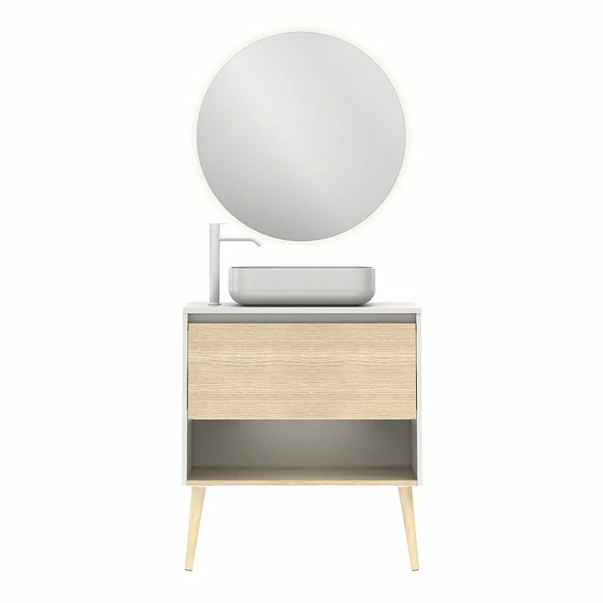 Meilleur prix ✨ Amizuva Ensemble de meuble, vasque et miroir NARA TOP avec un tiroir et un niche H.56,5 x L.80 x P.46 , effet Blanco Mate/ Chêne sablé ⌛