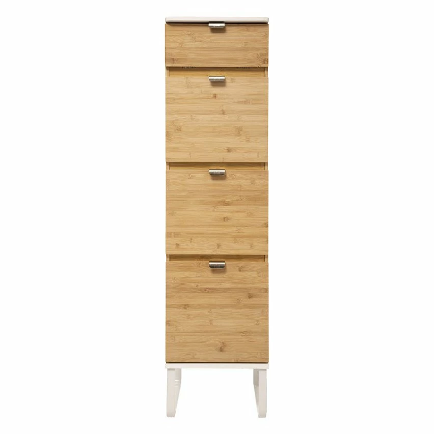 Craquez pour le style de ce chiffonnier avec miroir Levia en bambou en coloris naturel et blanc. Idéal dans une chambre ou une salle de bain, le chiffonnier Levia dispose de 3 tiroirs et un abattant. Le + du produit : le plateau supérieur se lève pour accéder à un compartiment range poche avec plateau blanc amovible et un miroir intégré. A monter soi même. Dimensions : L. 33 x l. 33 x H. 130 cm. Poids : 19.8 kg. Matière : Bambou, fibres de bois MDF et métal. Marque : 5Five.