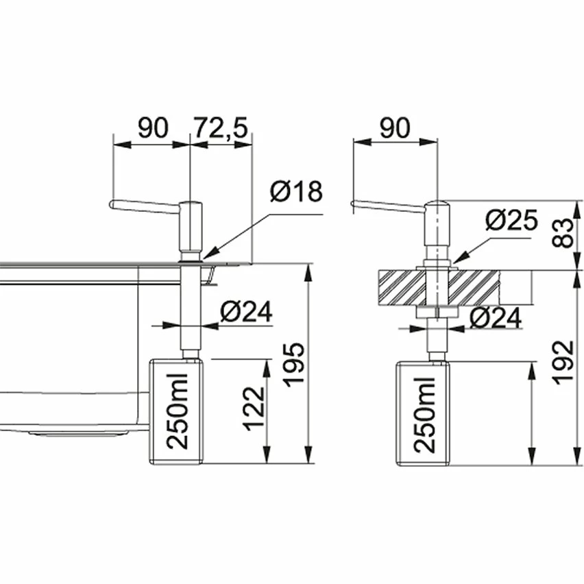 038260 – distributeur savon liquide 250ml encastrable – Distributeur de savon liquide Novita Franke 038260 avec remplissage par la tête du distributeur. Deux installations possibles : Sans collerette et avec collerette.Installation sans collerette (pour évier inox uniquement) : Embase ø 28, pour trou de perçage ø18, épaisseur de support inférieure à 10 mm (montage sur évier).Installation avec collerette : Embase ø 50, pour trou de perçage ø 25 à 35, épaisseur de support supérieure à 10 mm. – Diamètre de perçage : 18 mm (Evier), 25 mm (Fragranit).