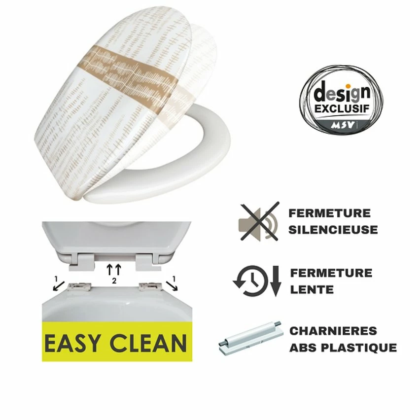 Abattant Wc de la marque MSV. HAUTE QUALITÉ: En matière Thermo-Dur avec charnières en plastique. La finition de haute qualité du siège Wc garantit une grande stabilité et une longue durée de vie. SYSTÈME EASY CLEAN: Son systeme Easy clip facilite considérablement le nettoyage du siège, il suffit de clipser pour le fixer, déclipser pour nettoyer et le tour et joué ! MÉCANISME FERMETURE LENTE: Avec cet abattant, finit les bruits dérangeants et les claquements. L’abattant Wc est doté d’un mécanisme de frein de chute en douceur intégré pour une fermeture silencieuse du couvercle. Le dessous est muni de crampons pour éviter les glissades ou les bruits forts. TENDANCE: Donnez à votre salle de bain non seulement un confort parfait, mais aussi une ambiance tendance. INFORMATION PRODUIT: Dimensions: 45,5x37x5cm Couleur: Beige Matière: Thermo Dur