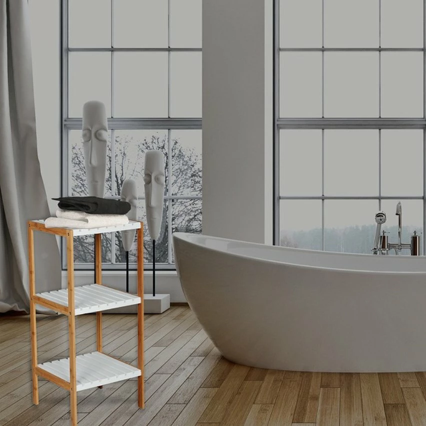 Etagère 3 niveaux de la marque MSV. Optimisez le rangement de votre salle de bain gâce à ce meuble qui fournit un grand espace de rangement sans encombrer votre salle de bain. Fabriquée en Bambou il est solide, ressitant à l’humidité et aux rayures. Son design naturel et moderne apportera une touche de charme à votre salle de bain. Dimensions: 34x33x78cm Couleur: Bambou & Blanc Matière: Bambou & MDF